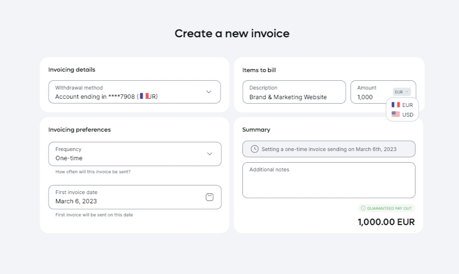 Remote gives you access to a highly secure, streamlined dashboard that makes invoice management and international payments cost-effective and efficient. You can use our platform to get paid in euros hassle-free, without any hidden fees.