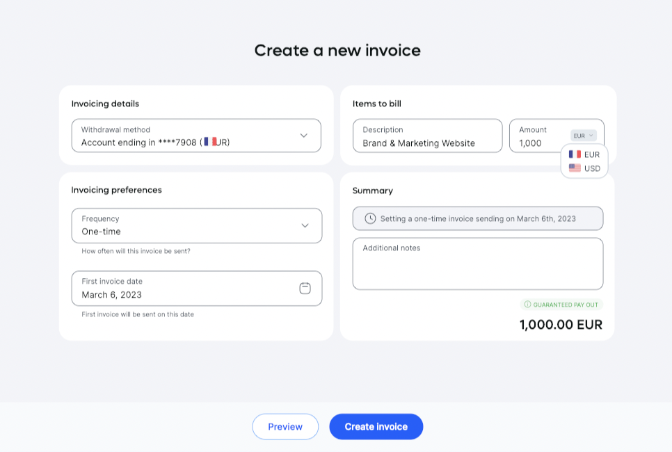 Our platform lets you automatically create invoices , submit them for approval, and subsequently get paid in your local currency without needing to switch to any other tool or software.