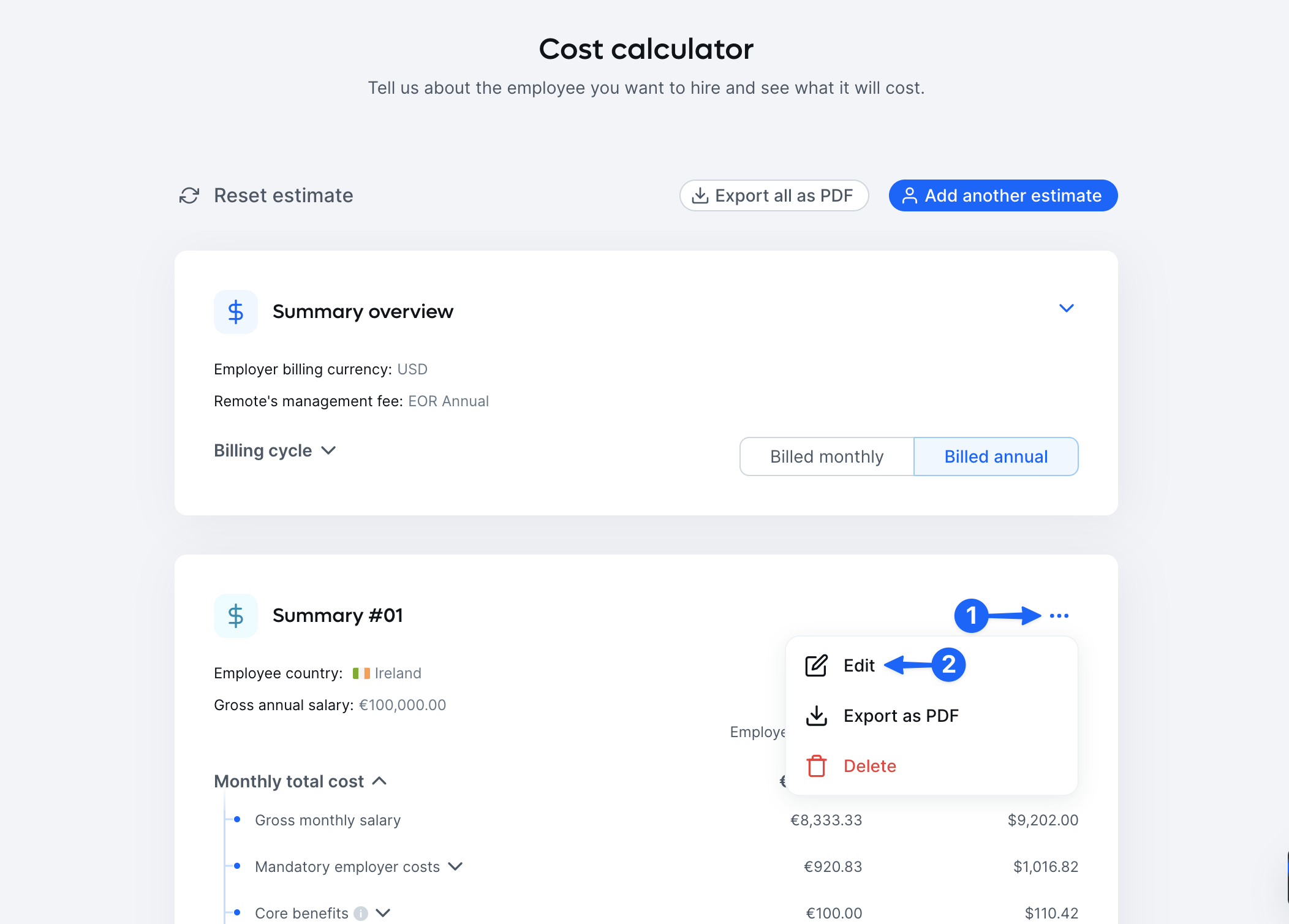 Remote customers have access to the complete suite of services in the full version of the Employee Cost Calculator. This customer-only tool will allow you to see cost breakdowns for mandatory contributions and supplemental benefits in a particular country. Our Fair Price Guarantee means that you’ll enjoy transparent and highly competitive rates with no hidden costs — wherever you hire.