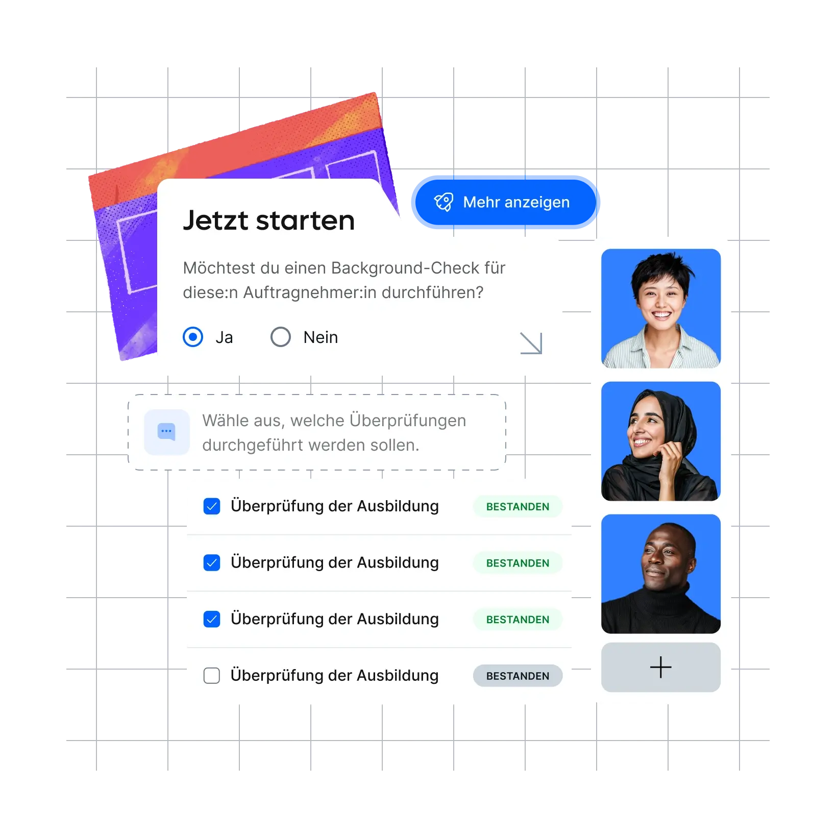 Überprüfe direkt auf der Plattform die Qualifikationen von neuen Mitarbeiter:innen und Freelancer:innen, um deine Risiken zu senken und alle Vorschriften einzuhalten.