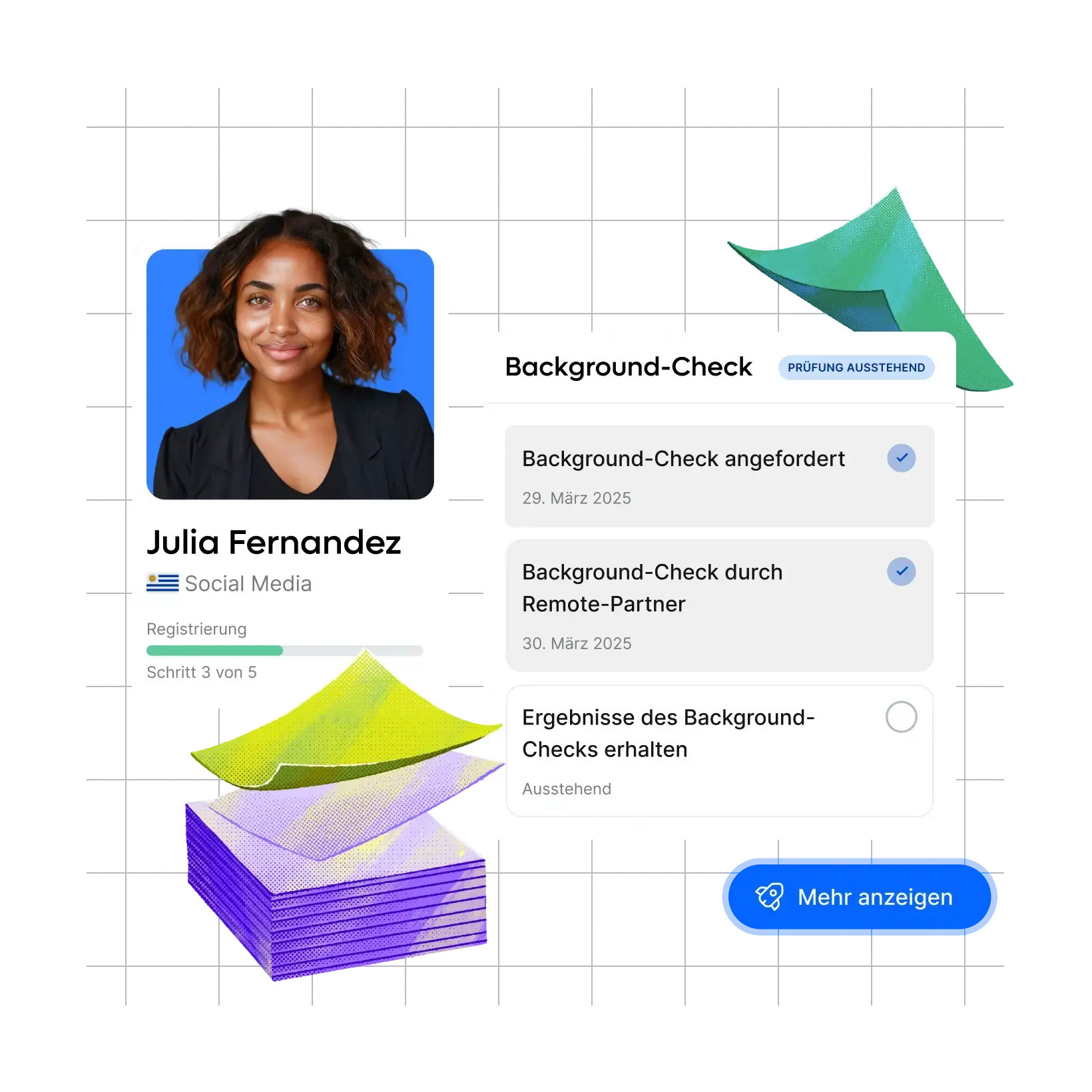 Wir haben Background-Checks direkt in den Onboardingprozess integriert. Die Prüfung erfolgt ganz ohne Einbindung von Drittanbietern. Du erhältst schnelle, nachvollziehbare Ergebnisse auf deinem Remote-Dashboard.