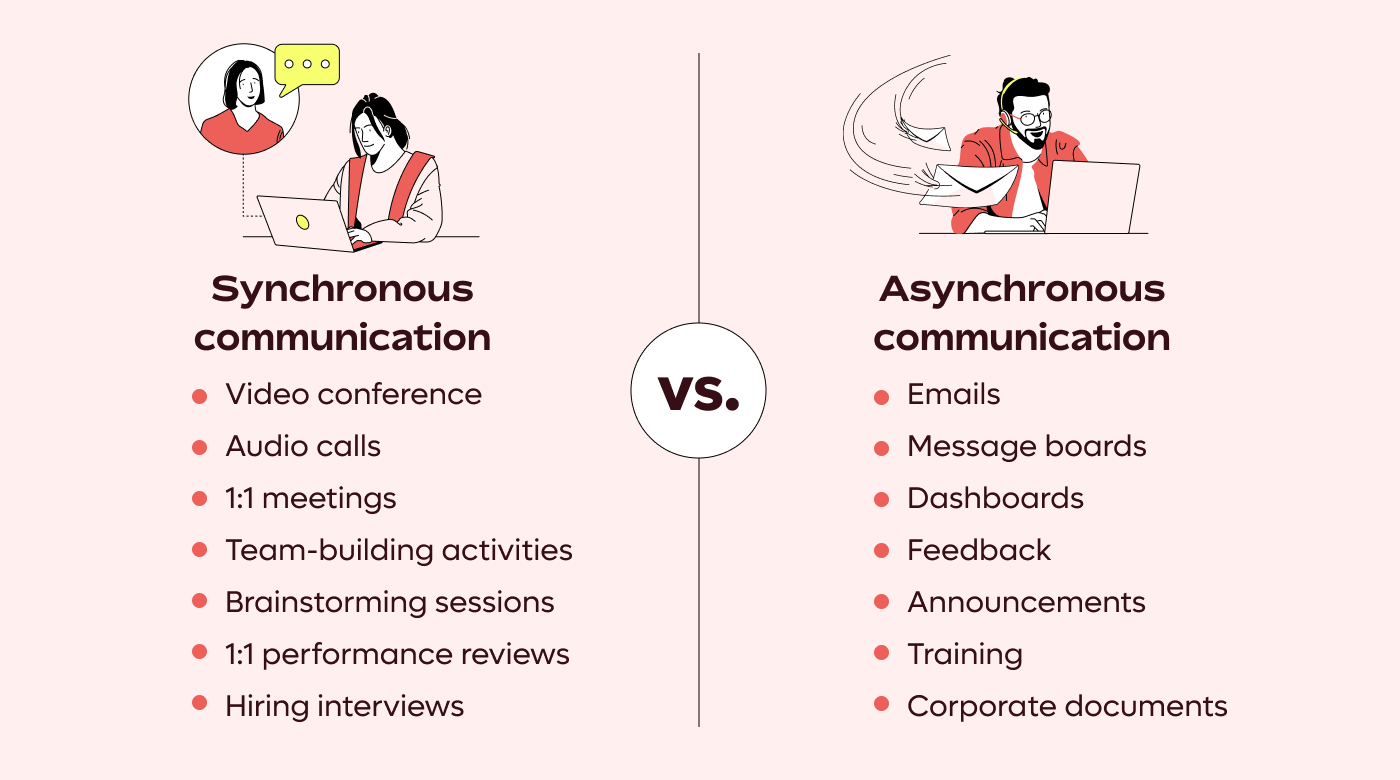 Wer Remote-Teams in unterschiedlichen Zeitzonen hat, sollte ein System für die asynchrone Kommunikation einführen. In einer Umfrage gaben 57 % der Unternehmensinhaber:innen an, dass auch ihre Kunden die asynchrone Kommunikation bevorzugen. Diese Kommunikationsmethoden sind asynchron bzw. zeitversetzt: