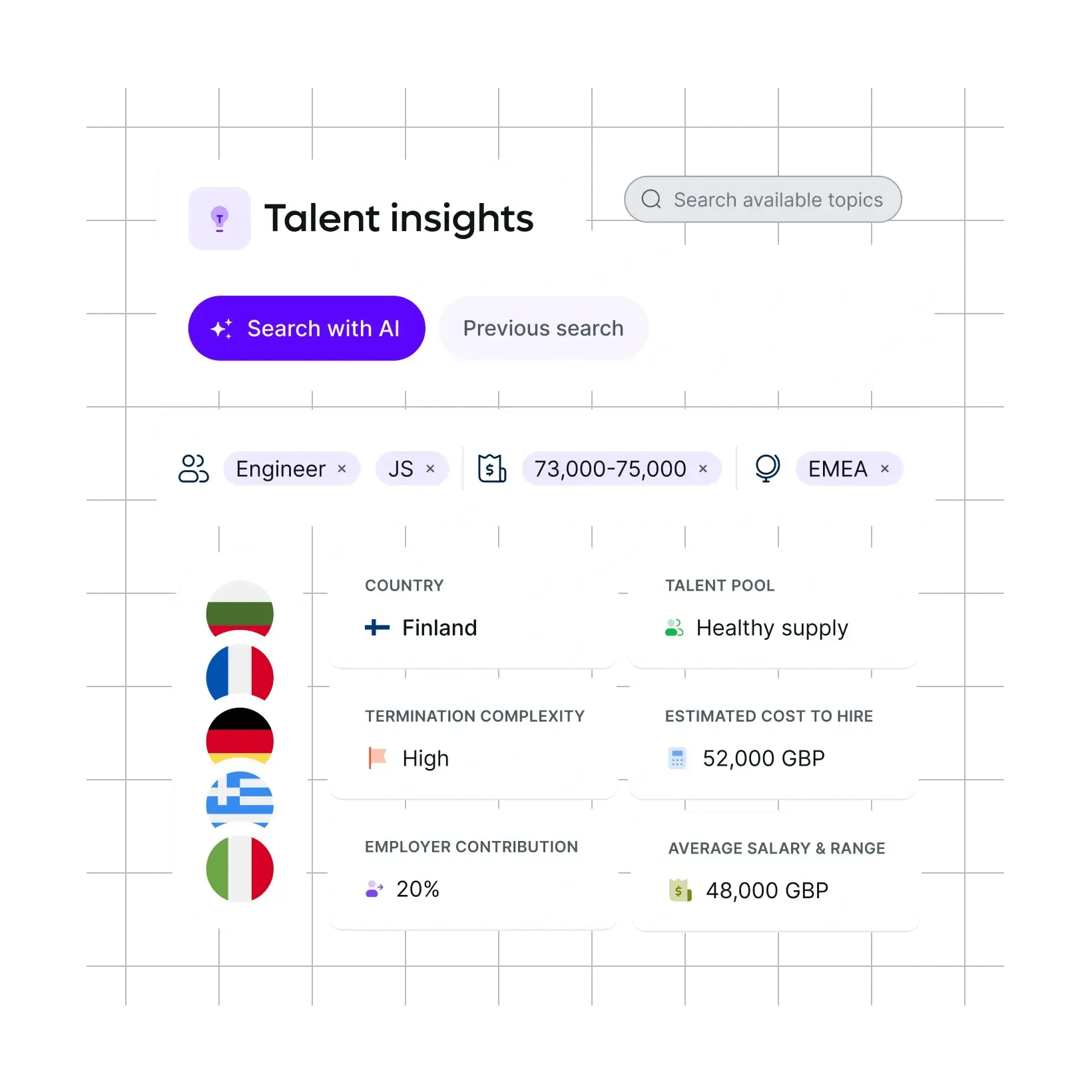 Use real-time talent data to compare talent availability, hiring costs, and legal complexity across countries.