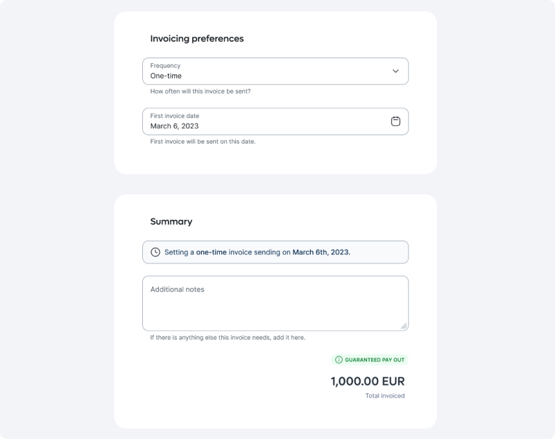 El Freelancer Hub de Remote te permite crear tus facturas, hacerles seguimiento e incluso automatizarlas. Y lo que es aún mejor: Remote te permite fijar un calendario de facturación periódica que permanece activo mientras dure el contrato. Esto facilita que la rutina de pagos sea coherente tanto para ti como para tus clientes.