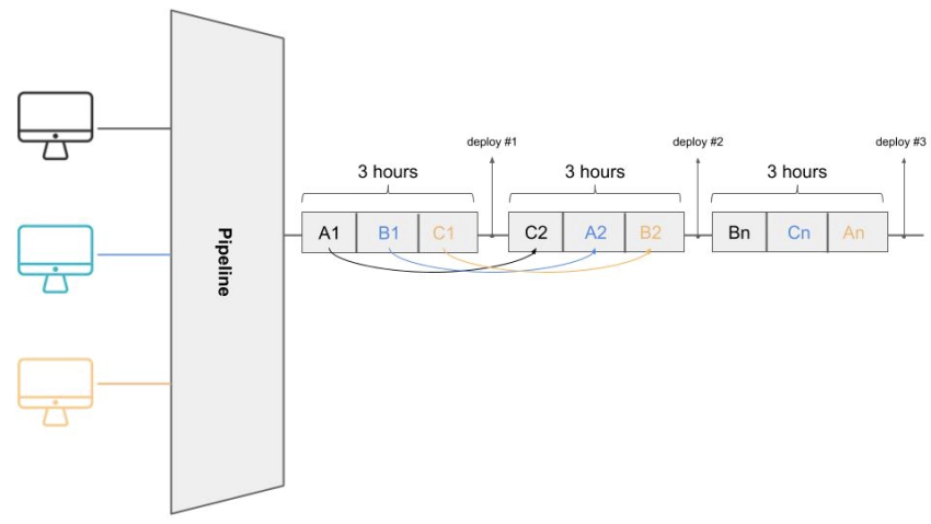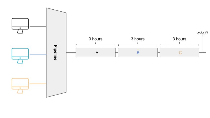 Esta imagen representa un flujo de desarrollo de software de tres terminales organizado mediante planificación sincronizada. Para implementar una función, necesitamos que se completen las tareas A, B y C. Dada la forma en que se planificaron y distribuyeron estas tareas, necesitamos un ciclo de 9 horas de trabajo por implementación. Esto es estupendo para tareas atómicas, pero muy lento por lo demás, ya que solo podemos implementar cada cierto tiempo.