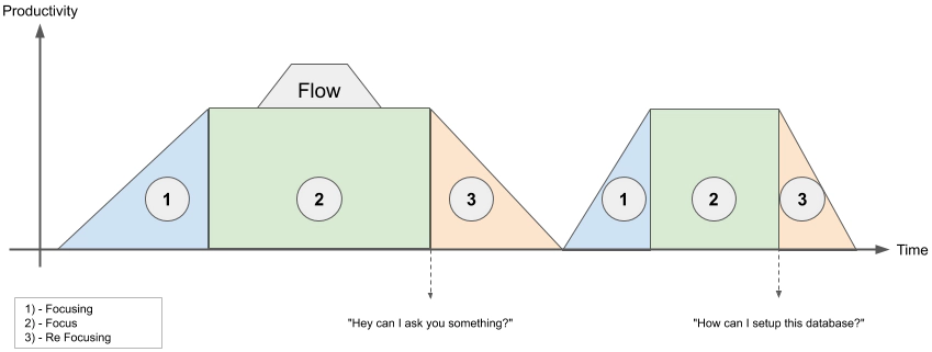 El desarrollador del backend pasó un tiempo concentrándose en la tarea que tenía entre manos (1) y, a continuación, pasó a un estado de concentración (2). Esta fase (2) es la que queremos maximizar, ya que durante la concentración sacamos lo mejor de nuestros cerebros supercreativos y poderosos. Entonces, cuando se le interrumpe, el desarrollador dedica un tiempo a responder a la pregunta del desarrollador de front end (3) para, luego, volver a la tarea inicial (1). Desgraciadamente, cuando el desarrollador vuelve a trabajar concentrado (2), se produce una nueva interrupción (3).