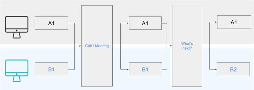 Este ejemplo ocurre muy a menudo. En este caso, una reunión sobre un requisito técnico interrumpe a ambos desarrolladores durante un periodo de tiempo específico. Poco después, hay otra llamada sobre lo que se debe hacer a continuación.