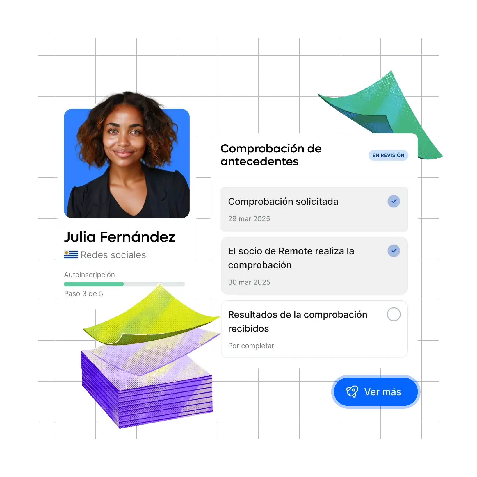 Las comprobaciones de antecedentes están metidas directamente en el flujo de integración de Remote, sin proveedores externos, lo que ofrece resultados rápidos y un seguimiento claro desde tu panel de Remote.