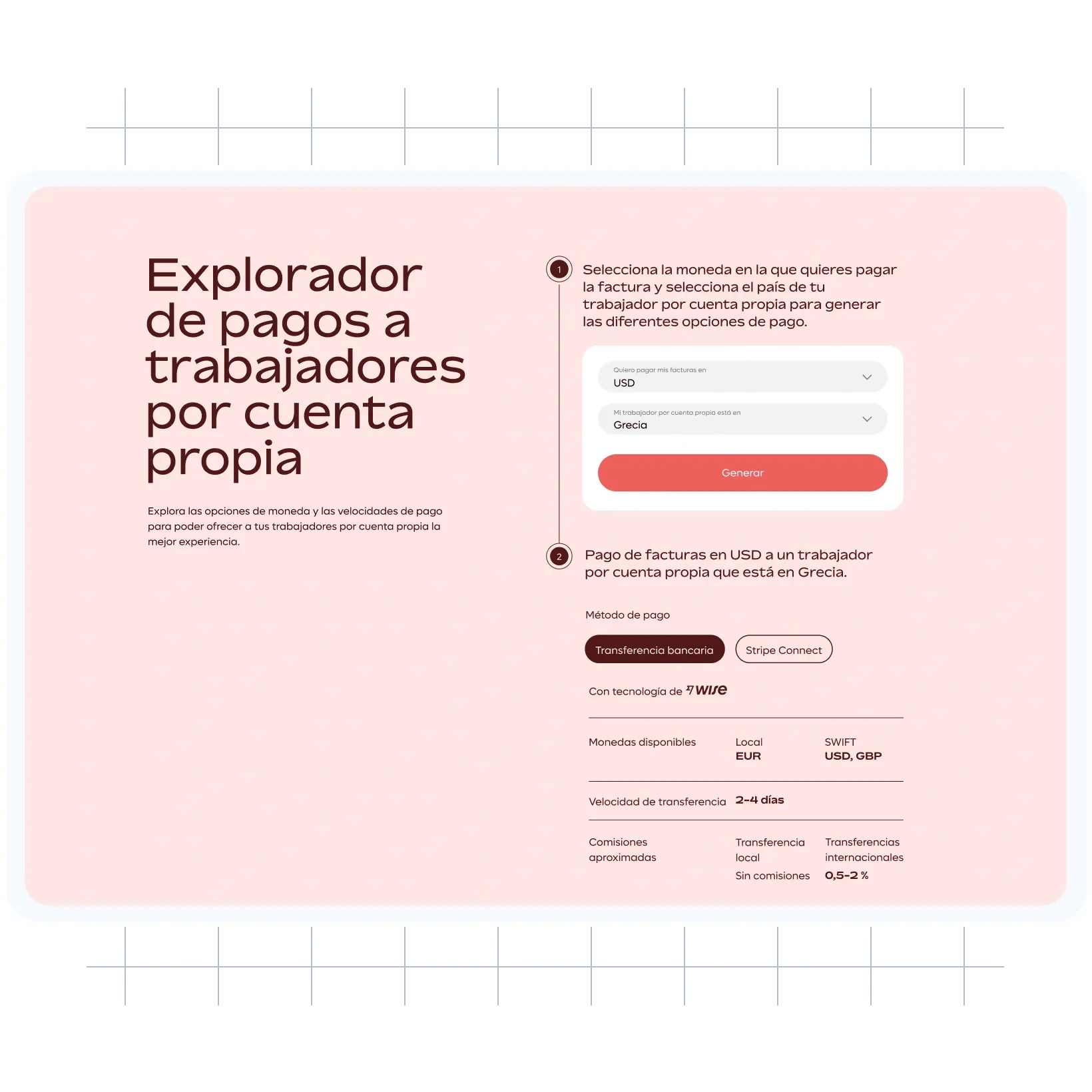 Averigua la moneda de tus clientes, explora las distintas opciones de transferencias y comprueba los plazos estimados de los pagos.