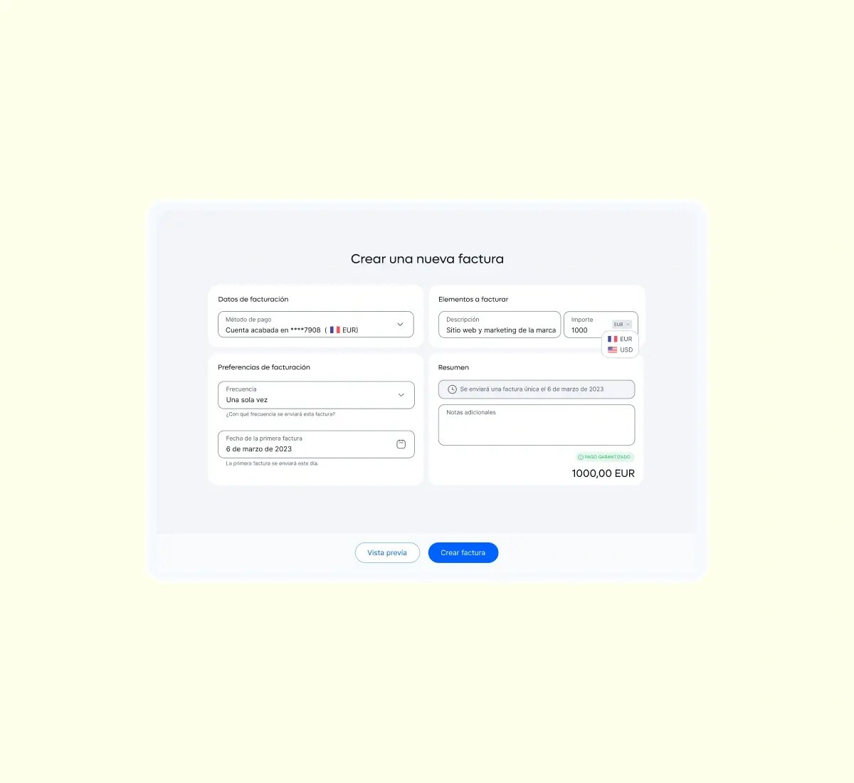 ¿Te da pereza todo eso del tipo de cambio, la conversión de moneda y demás? ¡Pues ya puedes respirar! Tú generas facturas en la moneda que prefieras y recibes la cantidad exacta, garantizado.