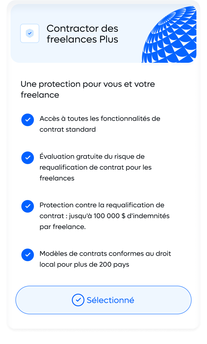 Gestion des freelances Plus est un module complémentaire qui protège votre entreprise contre le risque de requalification de contrat. Gestion des freelances Plus offre toutes les fonctionnalités de Gestion des freelances de Remote, ainsi qu'une indemnisation garantie jusqu'à 100 000 USD par entrepreneur et 1 million USD par client.