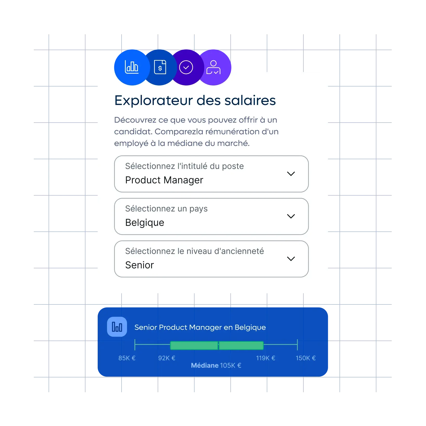 Lancez une recherche par intitulé de poste, niveau d’expérience et lieu pour obtenir les données de rémunération spécifiques au marché.