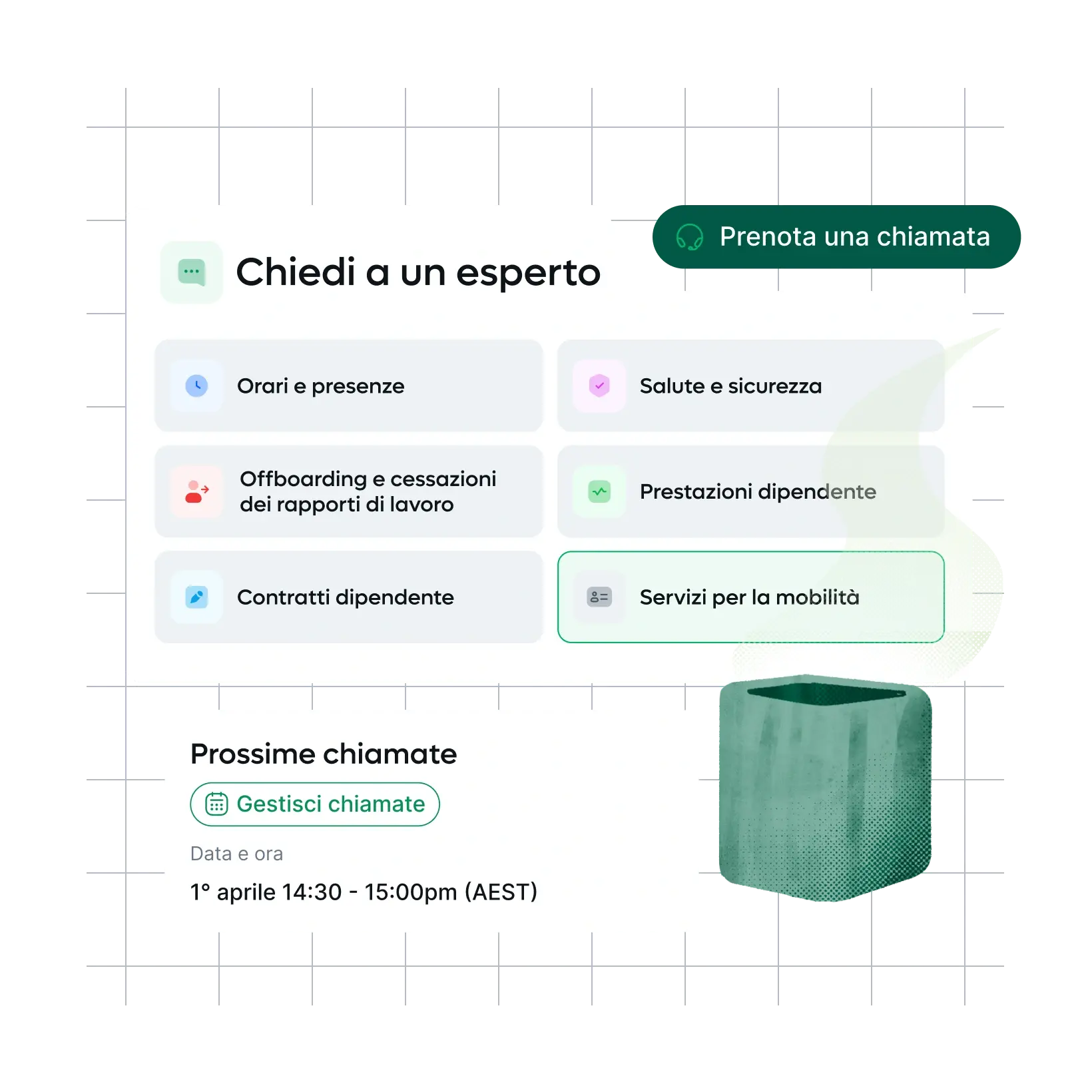 La funzione Chiedi a un esperto risponde a un’ampia gamma di quesiti sul lavoro. Ecco alcuni argomenti per cui puoi è possibile prenotare una chiamata.