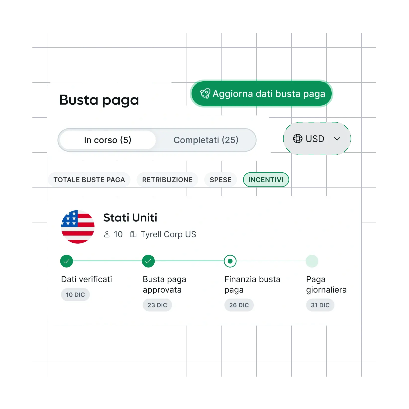 Gestione buste paga completamente conforme e localizzata, con supporto globale e pagamenti multi-valuta senza intoppi.