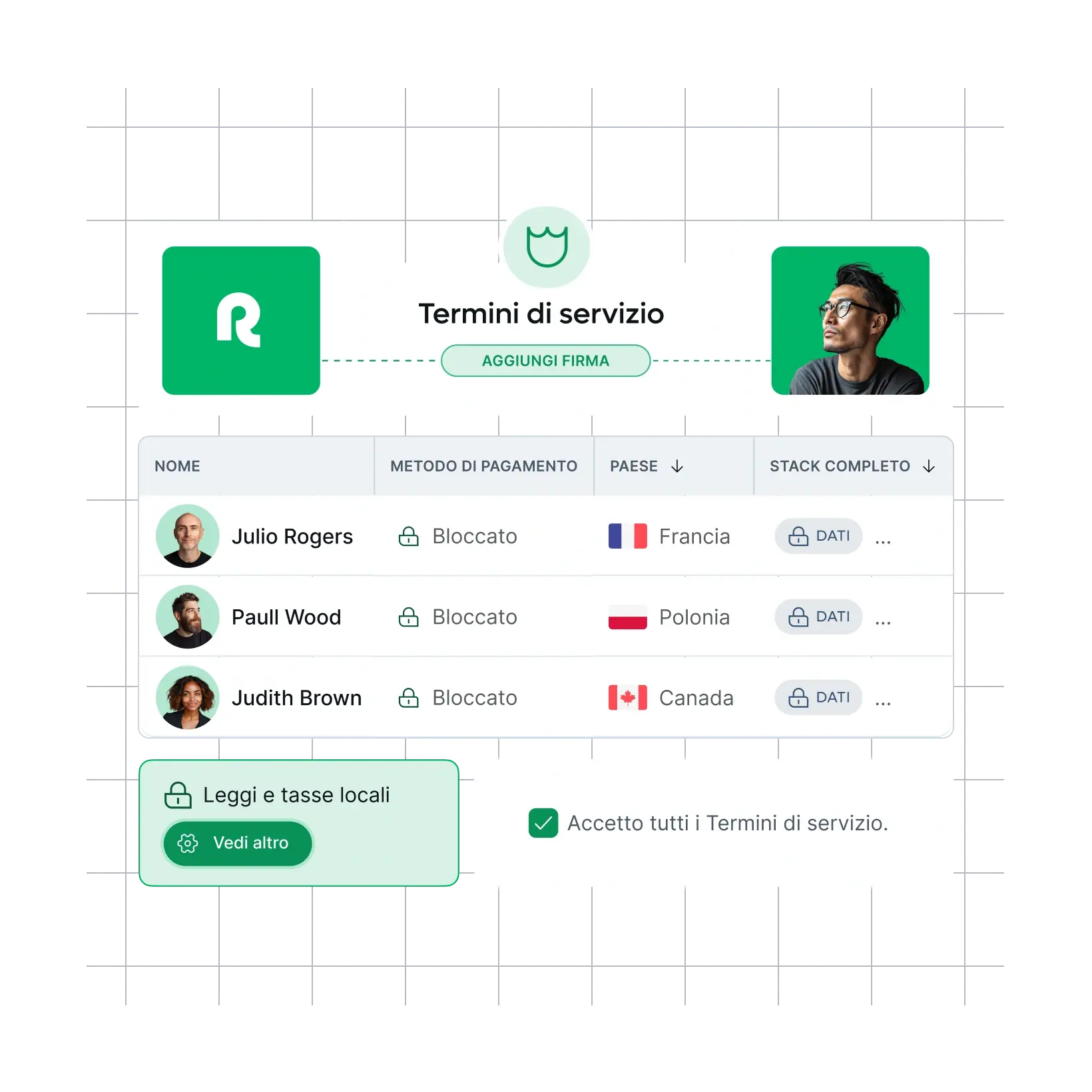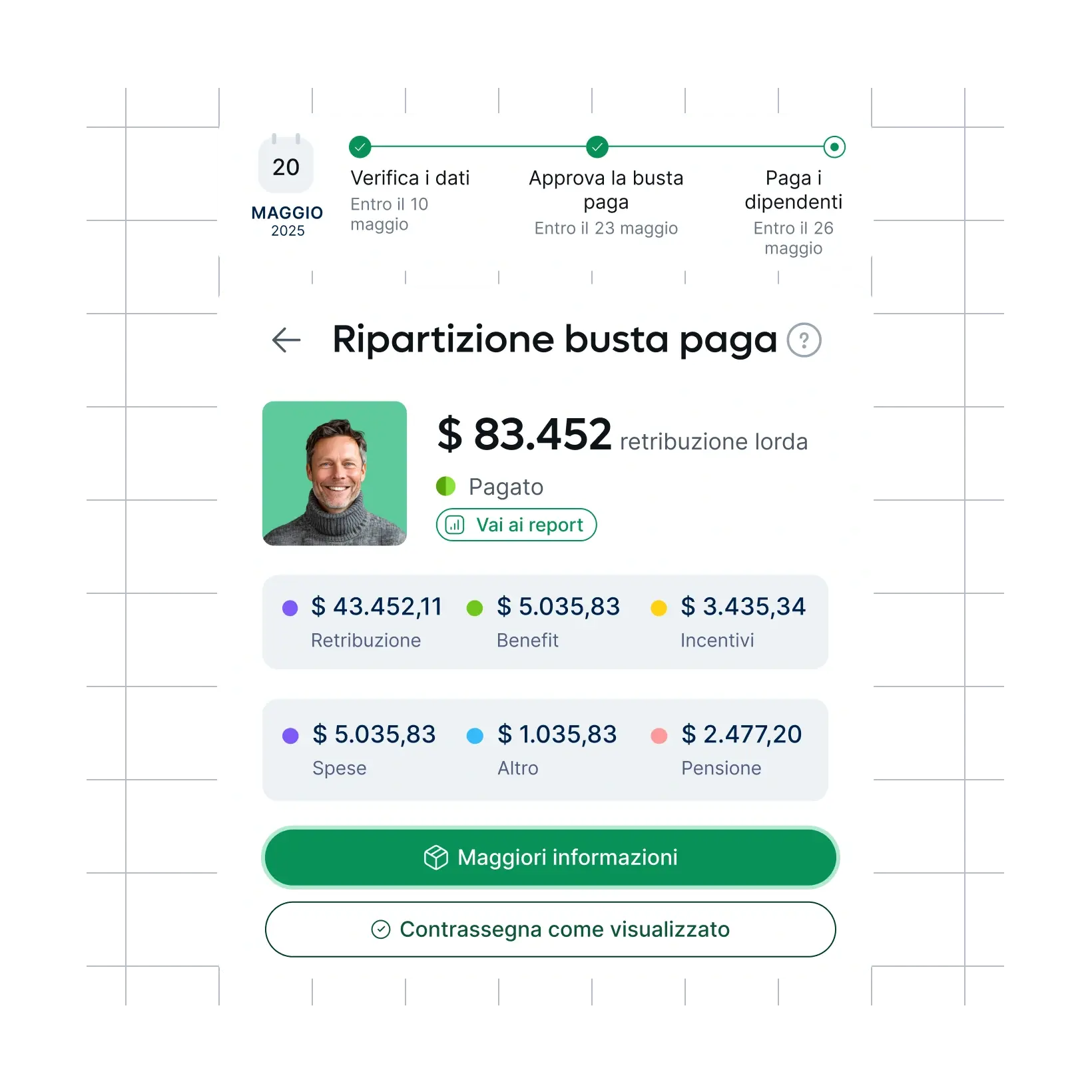 Dai dipendenti a tempo pieno in Canada ai collaboratori esterni in Australia, gestisci in modo unificato visibilità e controllo su ogni Paese, valuta e tipo di contratto. Tutto in un’unica schermata.