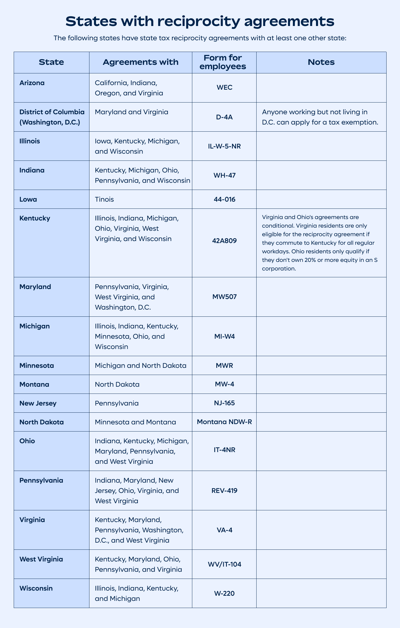 相互納税協定を締結している州で働く従業員を持つ企業は、上表に示すように、従業員が各州の適切な書式で提出するようにしてください。