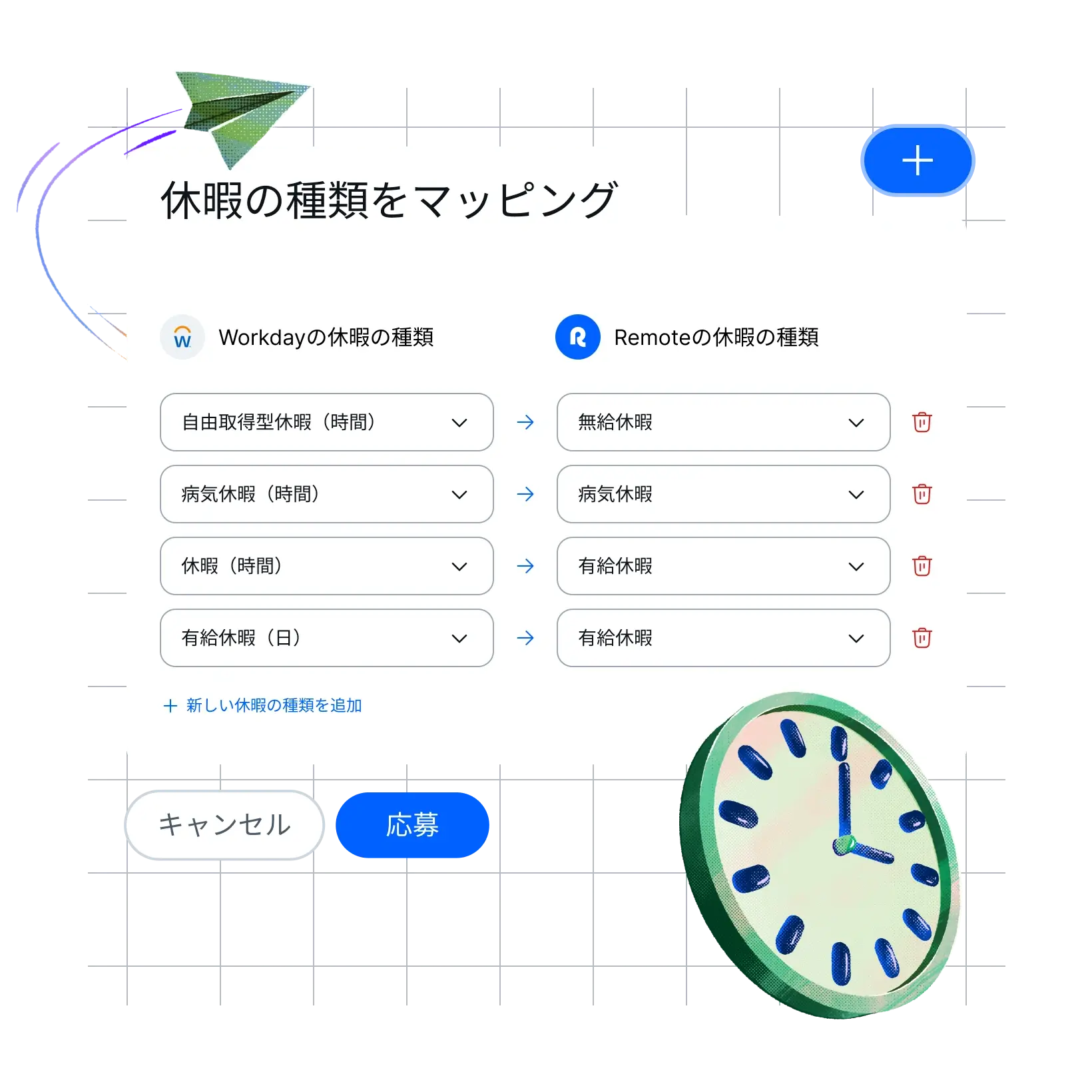 有給休暇、病気休暇、その他の承認済みの欠勤はRemoteに同期されるため、勤務時間、日割り計算、残日数が正確に反映されます。