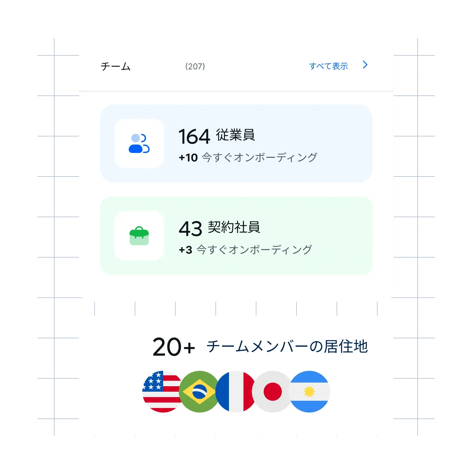 もう複数のツールは必要ありません。Remoteを利用すれば、オンボーディングからオフボーディング、その間のすべての段階で、グローバルチームを一元管理できます。