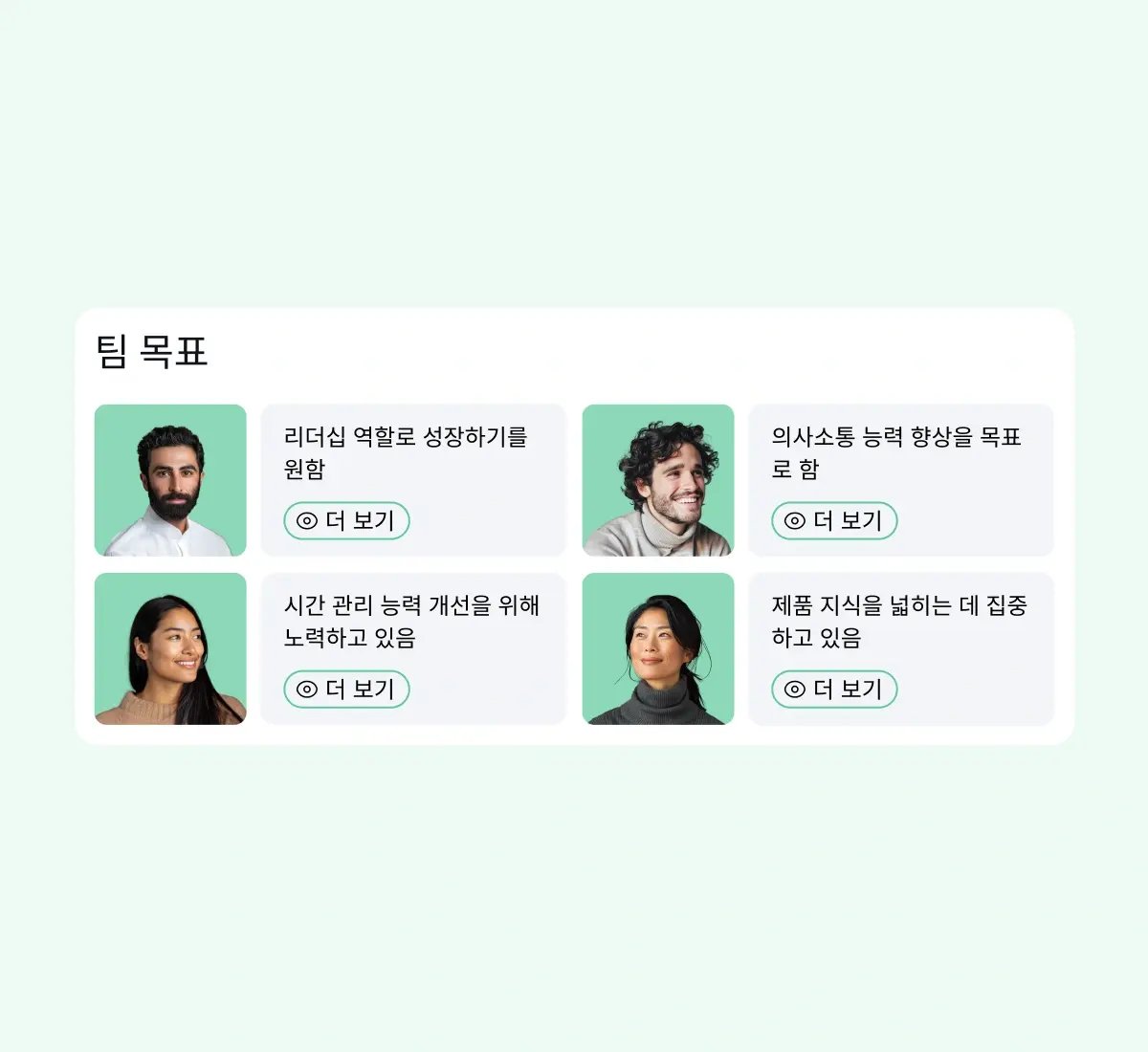 팀원들은 하나의 공간에서 협업할 수 있고, 도입률은 높아지며, 평가를 적시에 완료할 수 있습니다. 또한 리더는 승진, 학습 계획 및 유지 전략을 뒷받침하는 명확한 데이터를 얻게 됩니다.