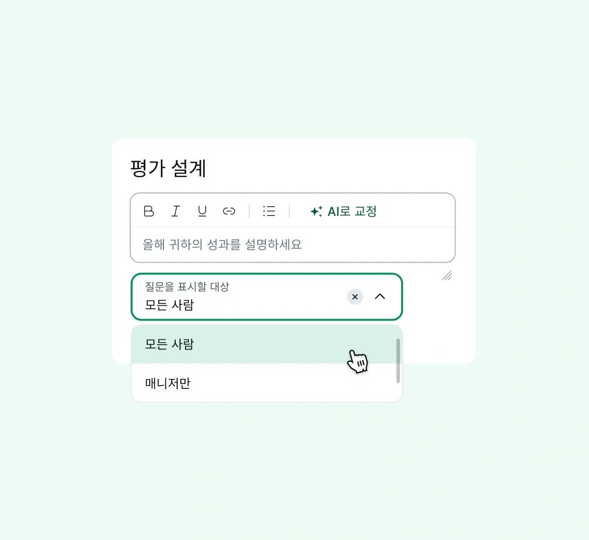 360도 평가를 포함해 반복 주기부터 일회성 주기를 손쉽게 운영할 수 있으며, 원하는 질문과 평가 방식을 자유롭게 설정할 수 있습니다.