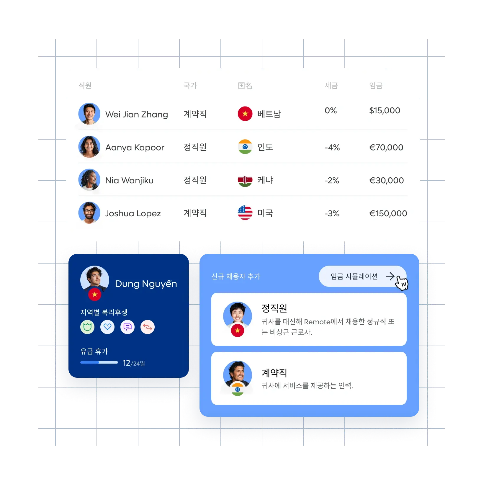 급여 관리, 직원 및 계약직 고용, 인사 관리 등 글로벌 팀을 자신 있게 확장하는 데 필요한 모든 것을 Remote에서 도와드립니다.