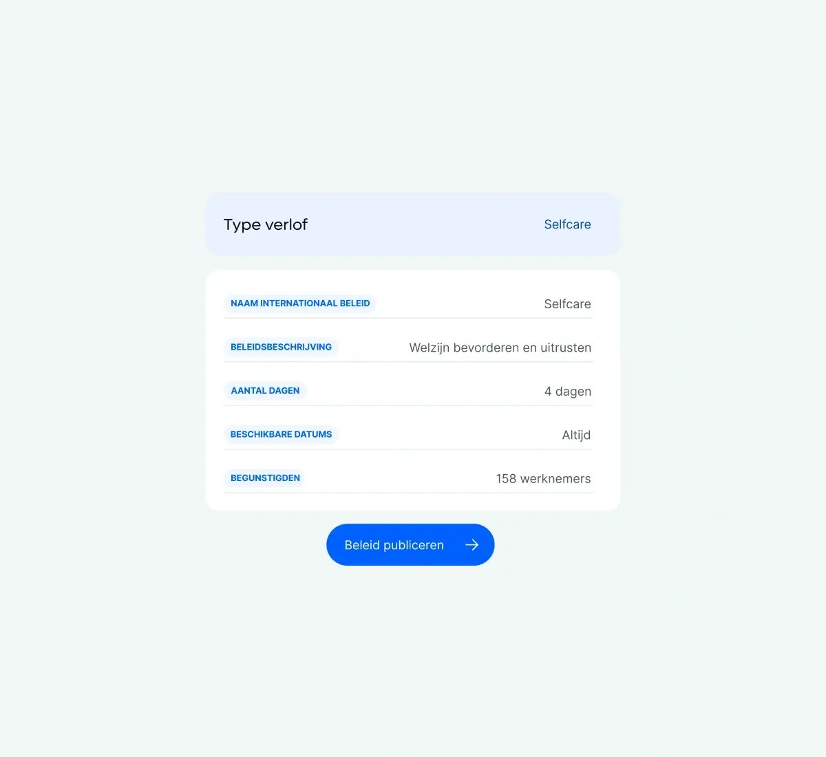 Maak aangepaste soorten verlof en ken ze toe aan werknemers zodat ze hun verlof kunnen plannen en opnemen. Onze klanten gebruiken deze functie vaak voor bijvoorbeeld een driemaandelijkse selfcare-dag, een vrije dag op je verjaardag, een sabbatical of aanvullend verlof.