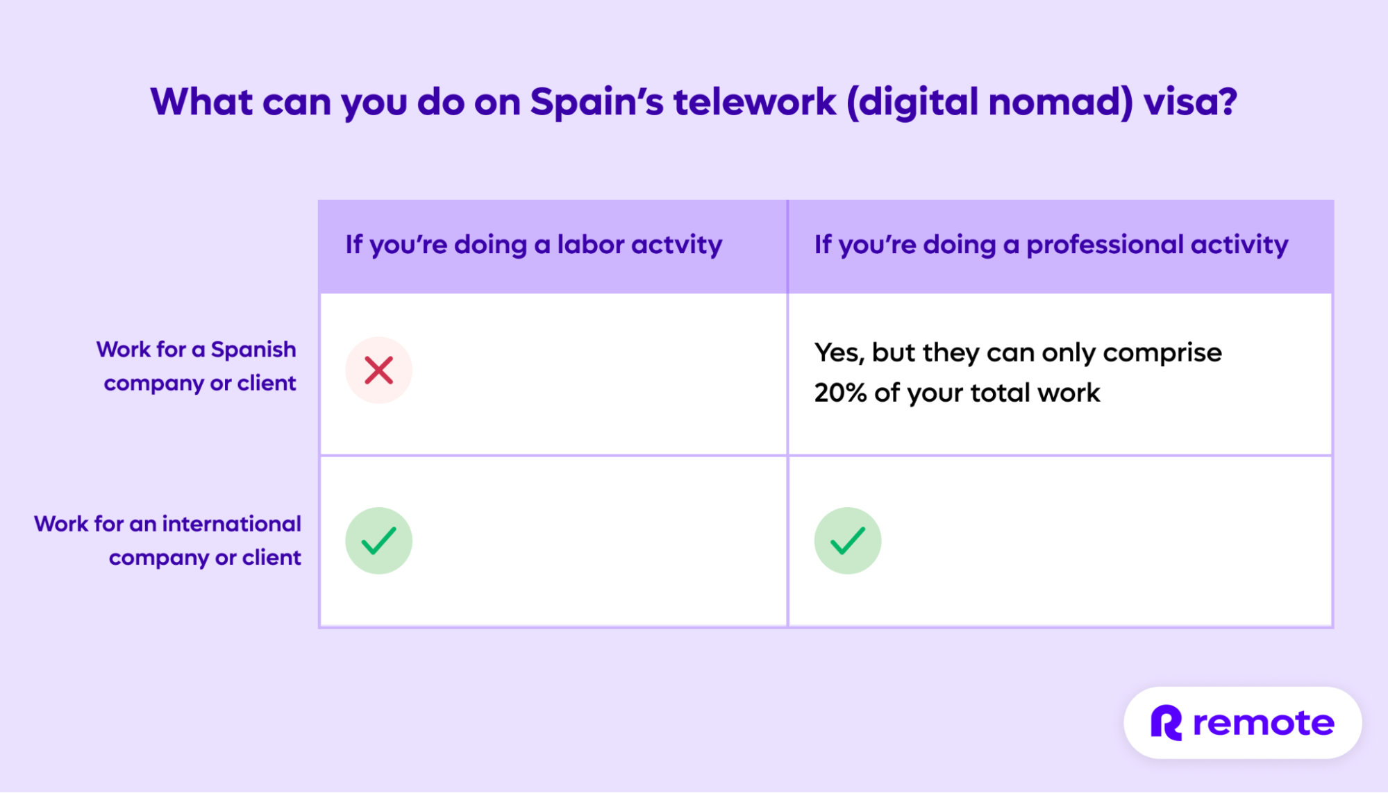 - Professionele activiteiten : Je kunt voor een Spaans bedrijf werken, maar dit werk mag slechts 20% van je totale werkzaamheden omvatten. Als je zzp'er bent, mogen Spaanse klanten slechts 20% van je klantenbasis vormen. De rest moet zich buiten Spanje bevinden.