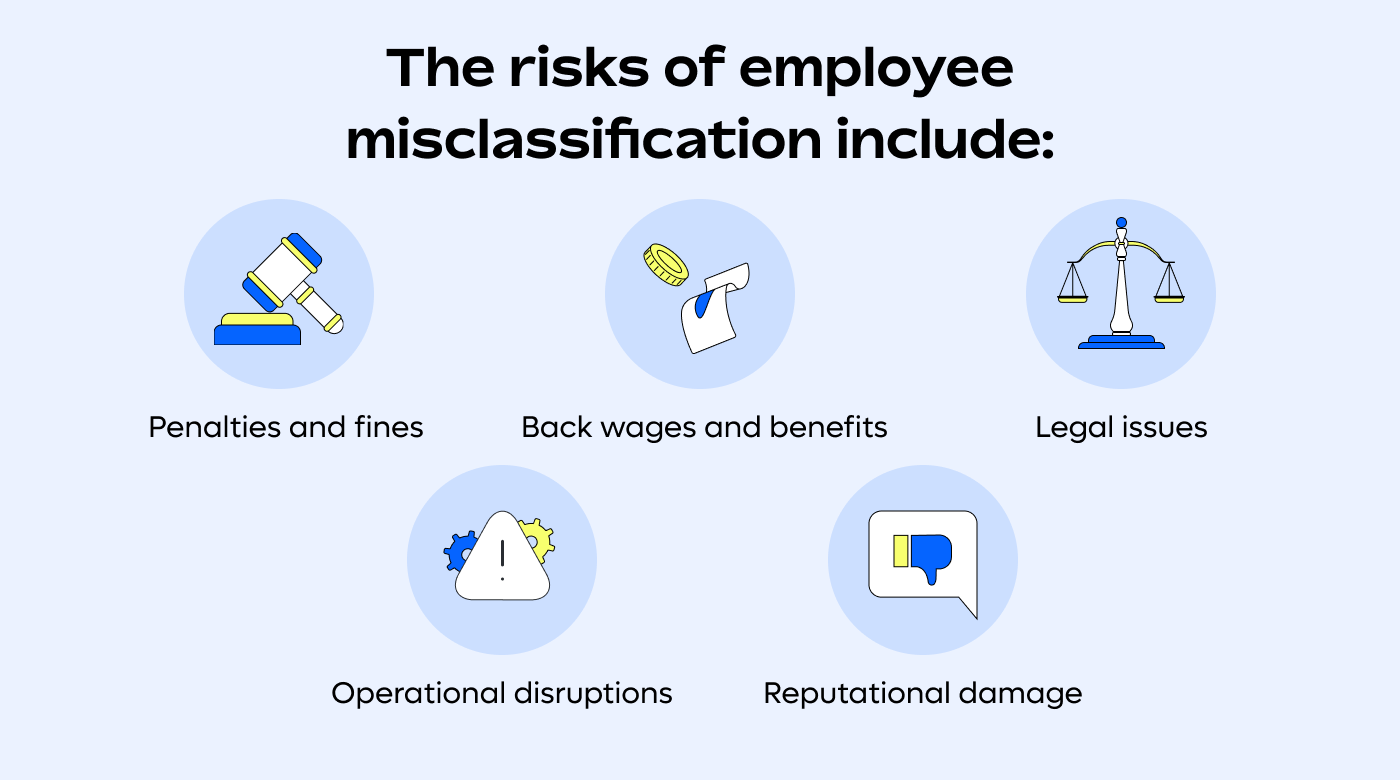 Als je je medewerkers verkeerd classificeert, kan het zijn dat hun payrollbelastingen (waaronder die voor sociale zekerheid, Medicare in de VS en werkloosheid) niet betaald worden. Je bedrijf kan geconfronteerd worden met juridische consequenties als het werknemers niet betaalt voor secundaire arbeidsvoorwaarden zoals pensioenbijdragen, een ziektekostenverzekering en andere voordelen. Deze belastingen niet inhouden of overmaken kan leiden tot straffen van de IRS. Je kunt ook verplicht worden om werknemers te compenseren voor derving van loon of secundaire arbeidsvoorwaarden door de verkeerde classificatie.