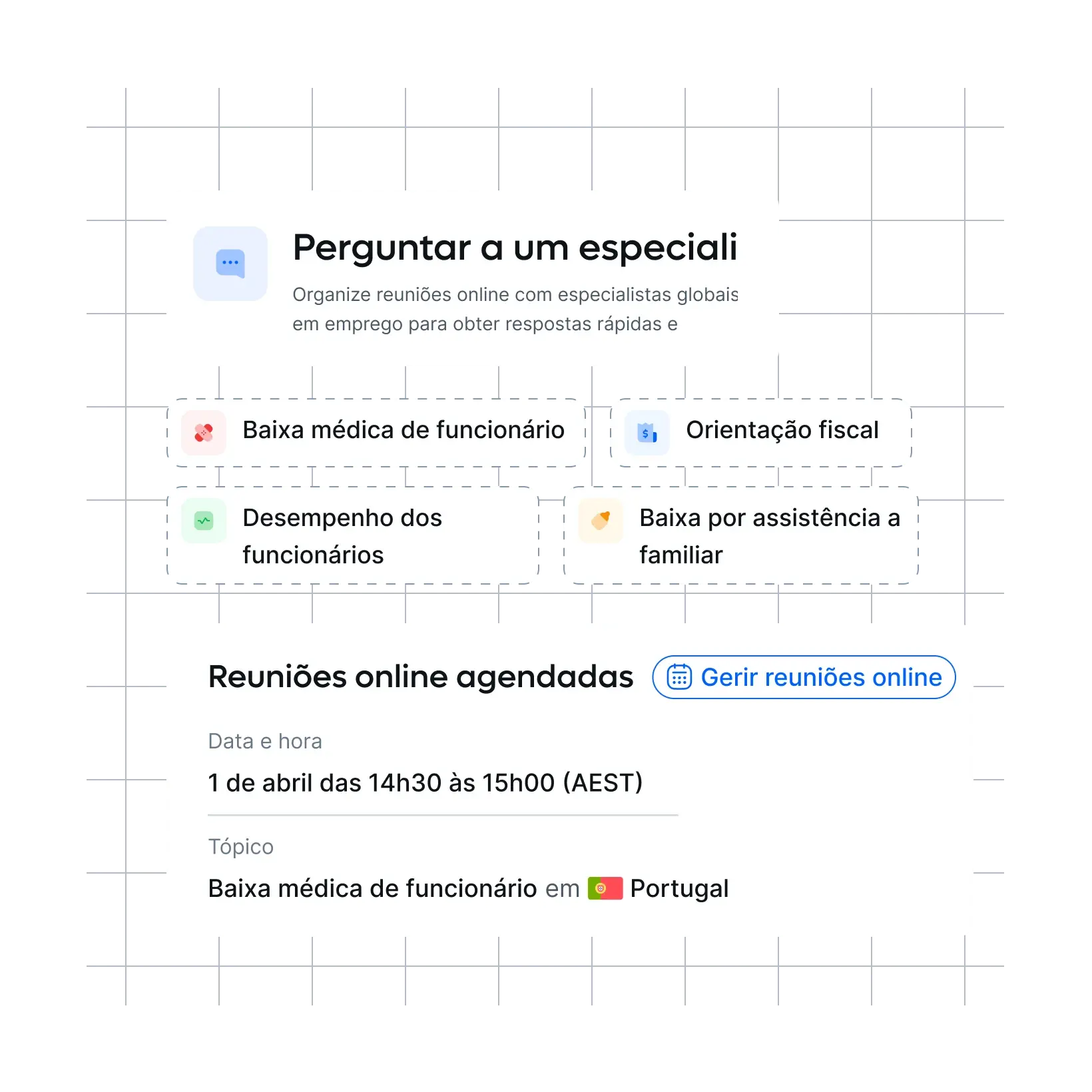 Faz chamadas de vídeo individuais com os profissionais jurídicos, fiscais e de RH internos da Remote para obteres orientação fiável em todos os países onde contratas.