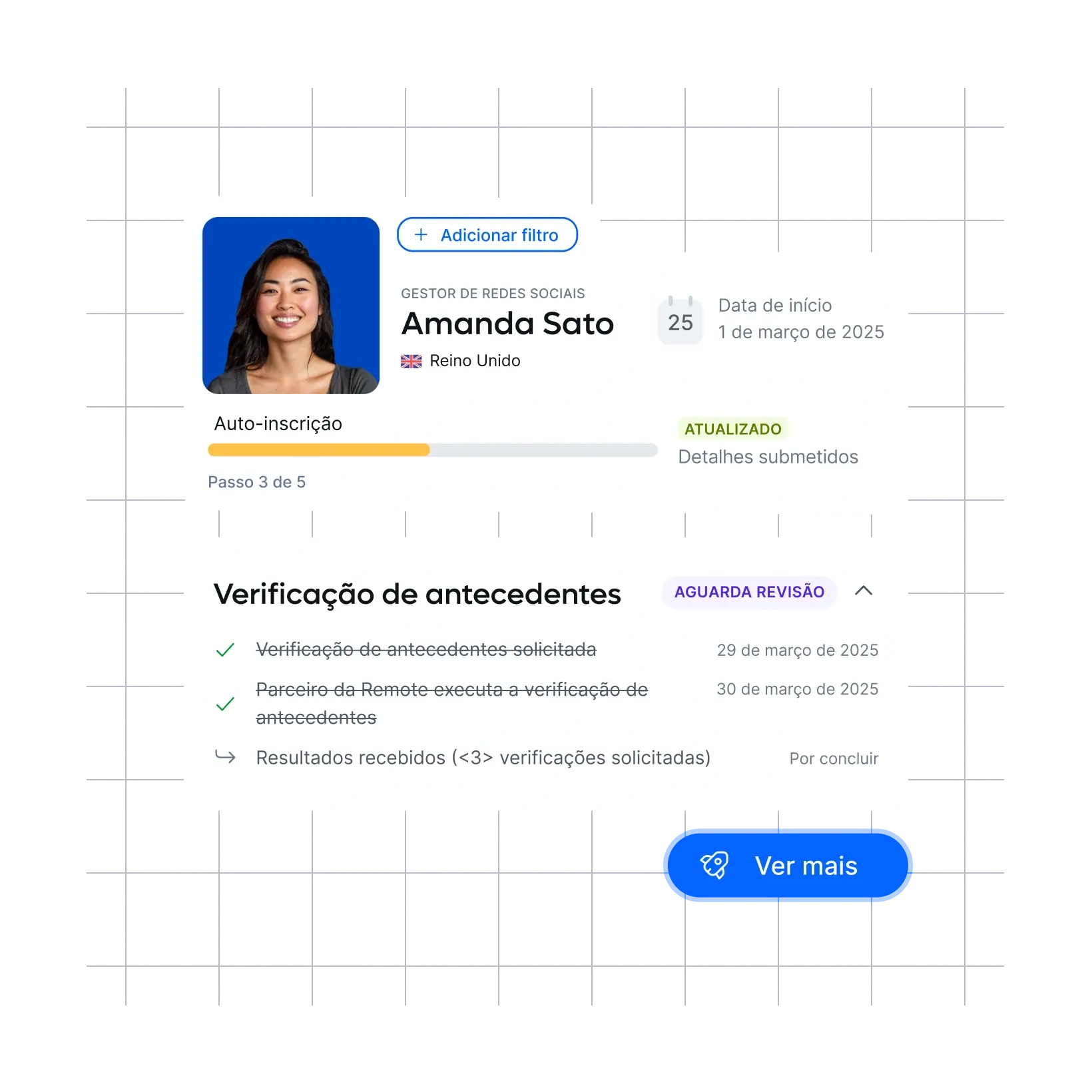 Efetua verificações pré-emprego em conformidade com as normas em todo o mundo, diretamente na plataforma Remote, sem fornecedores adicionais.