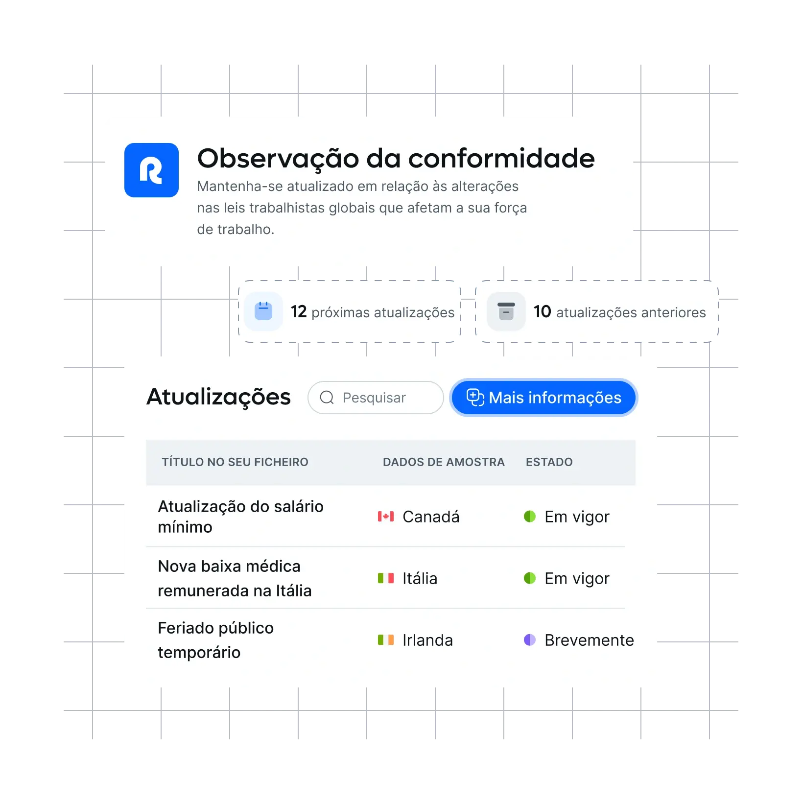 Poupa mais de 90 horas de monitorização manual por mês com a Observação da conformidade. A equipa jurídica interna da Remote monitoriza as alterações legislativas em mais de 90 países e depois divulga-as na plataforma com informações úteis.