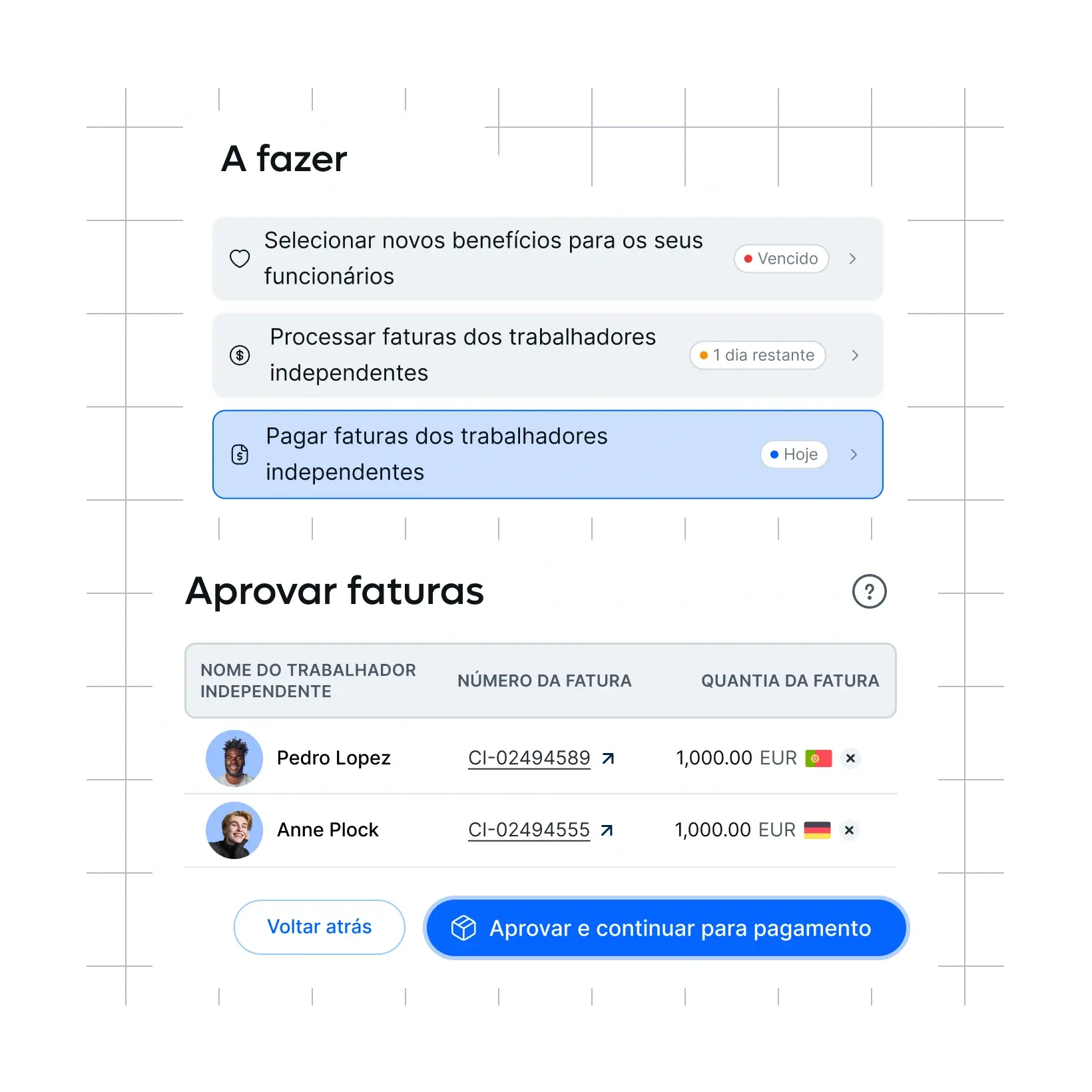 Fluxos de integração automatizados e específicos para cada país, com contratos adaptados localmente e configuração do processamento salarial, sem a necessidade de qualquer preparação jurídica da tua parte.
