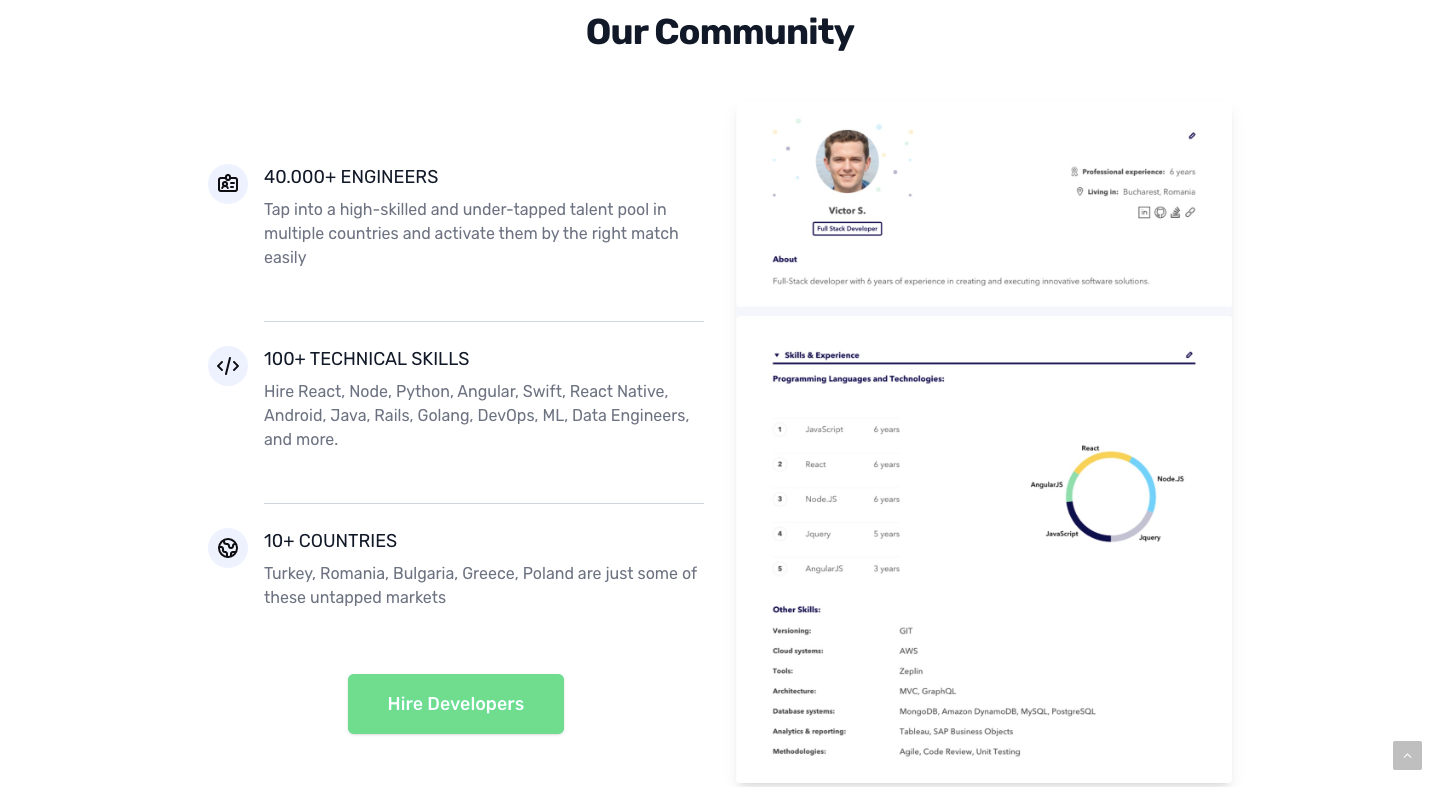 Our mission is to make hiring borderless, joyful, and efficient by creating meaningful matches between under-tapped talent and companies with the help of our community of 40K+ developers, dedicated Talent Partners, and own matching technology.