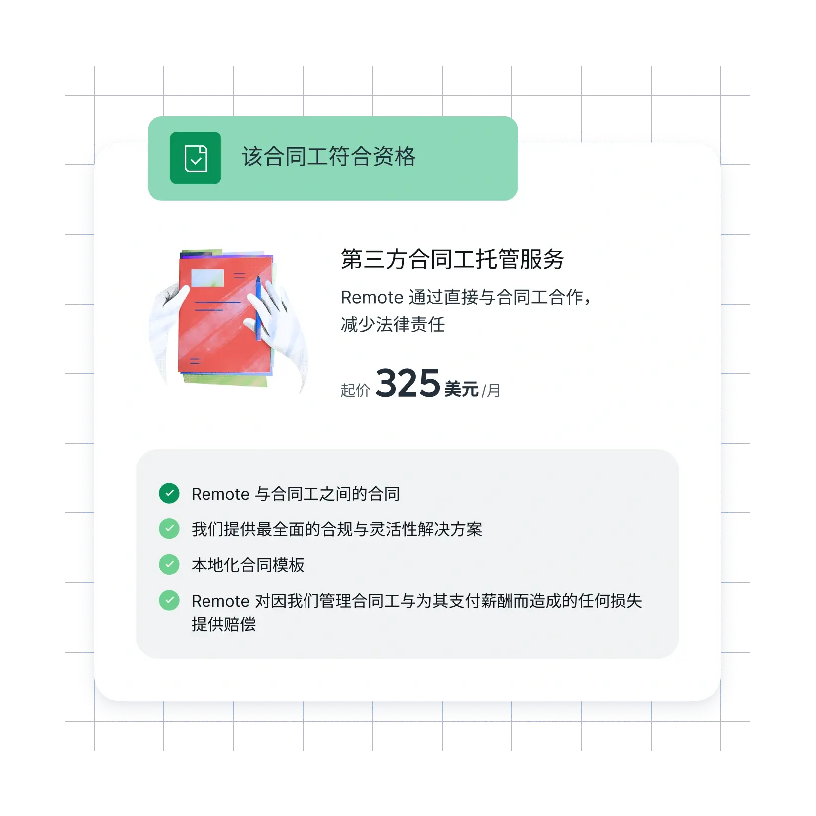 Remote 第三方合同工托管服务起价为每位合同工 325 美元/月。如需了解有关 Remote 第三方合同工托管服务的更多信息,请点击此处联系我们的团队。