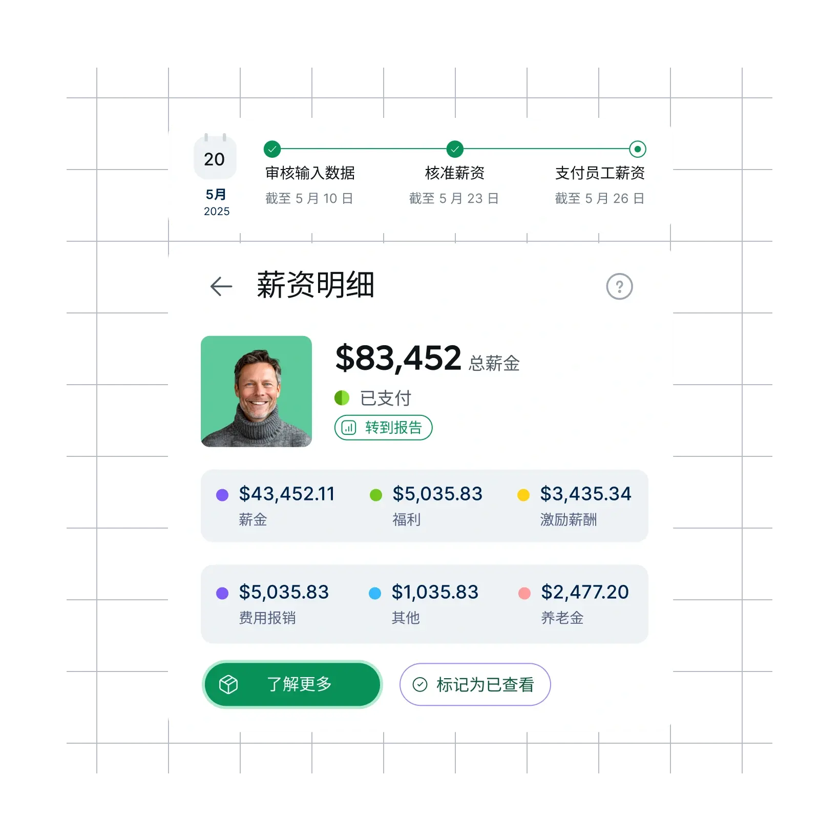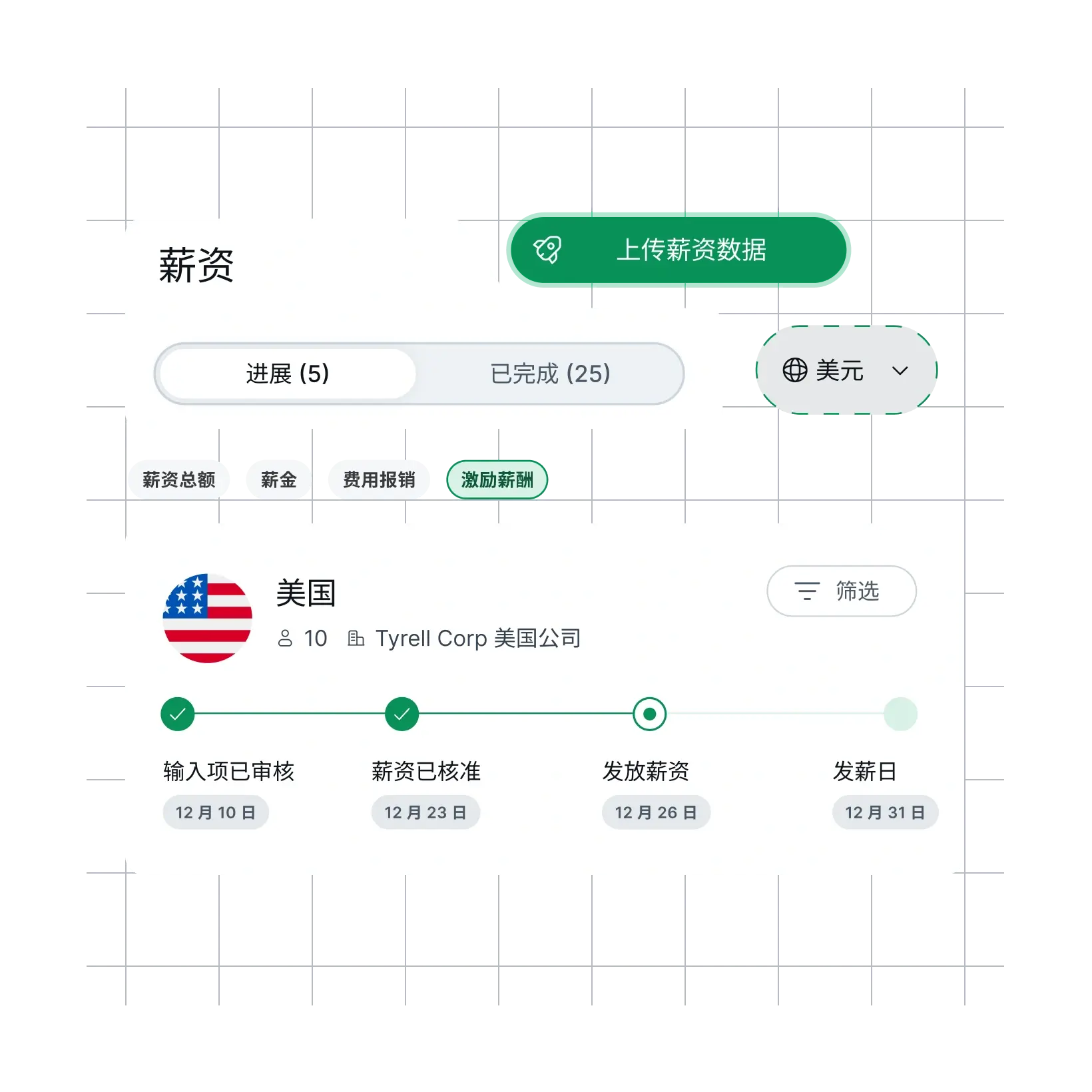 我们的集中式薪资管理平台助您轻松高效管理全球团队。从薪资发放、费用管理自动化到报表生成,我们的平台一站式简化薪酬管理全流程。