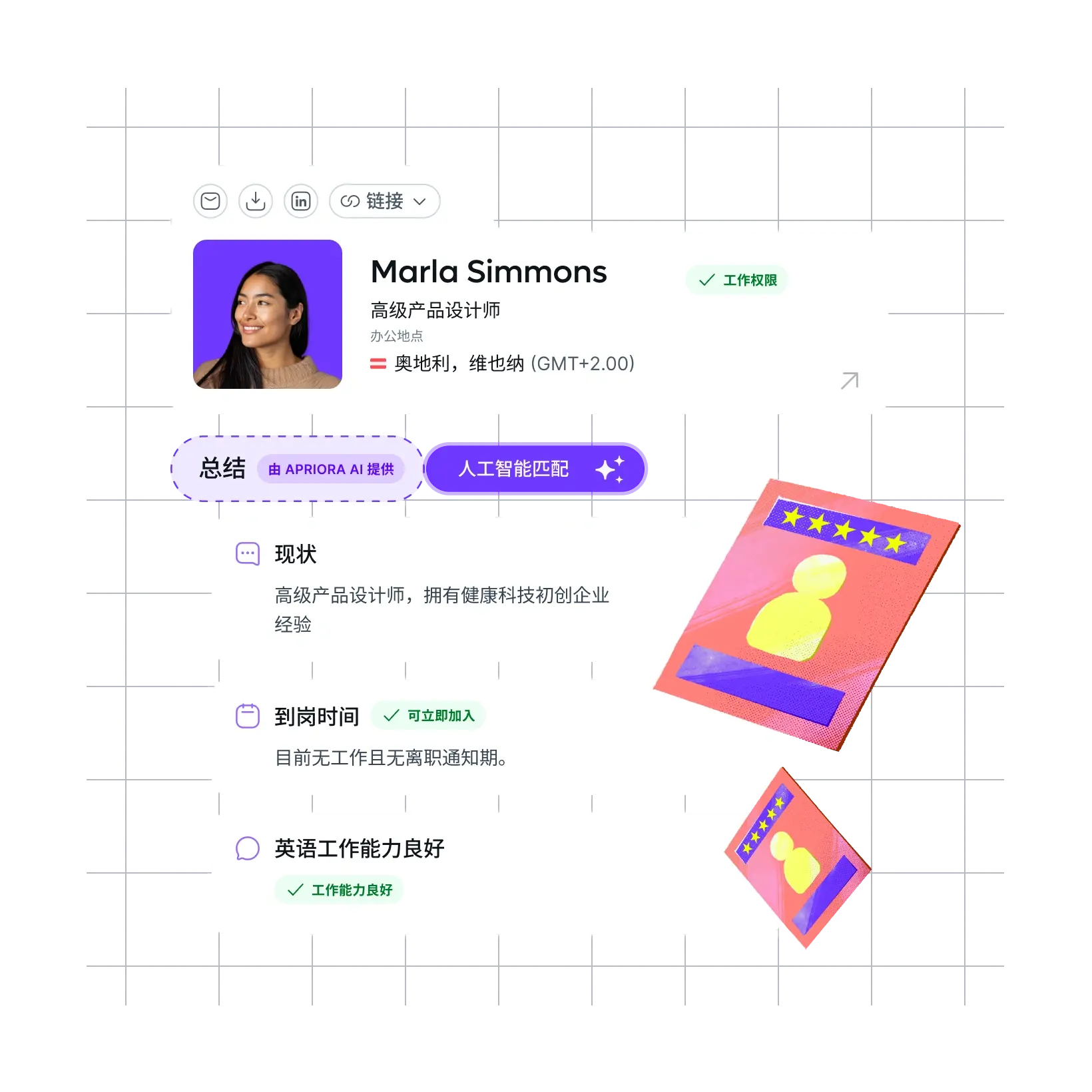 基于技能、经验、地点、到岗时间及工作风格等多维度智能推荐候选人。